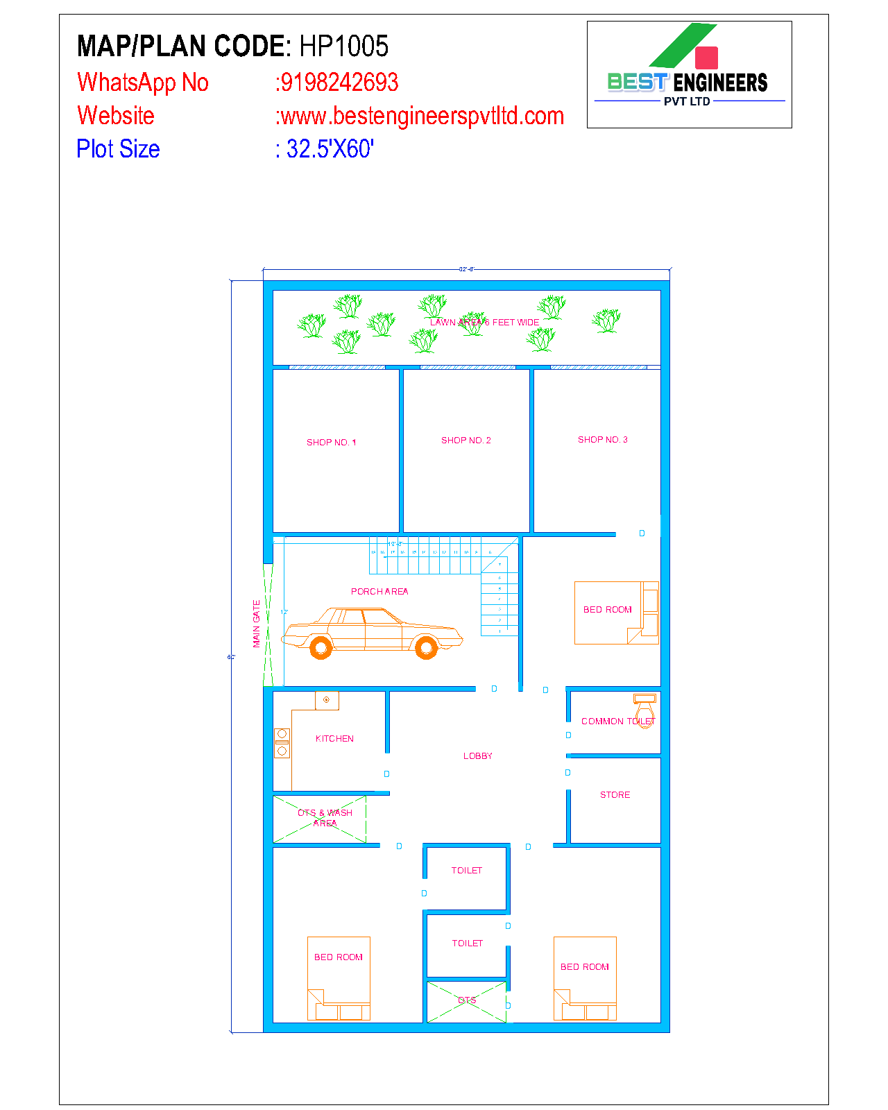32.5 x 60 House Plan with 3 Shops | 1950 Sq. Ft. Home & Commercial Design